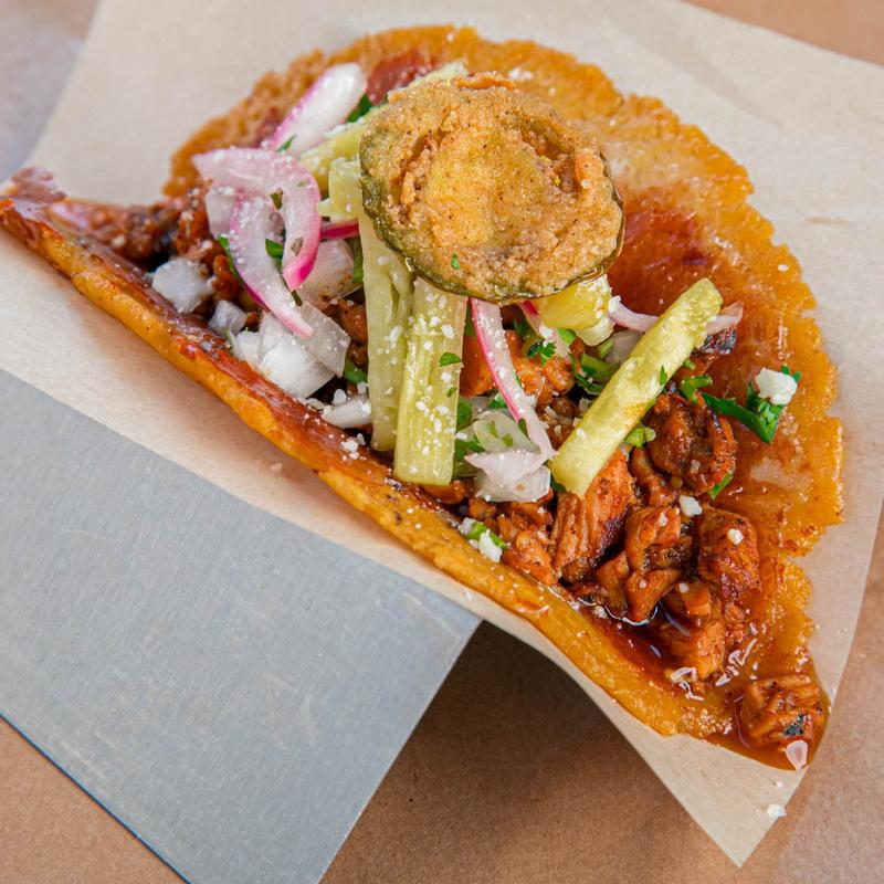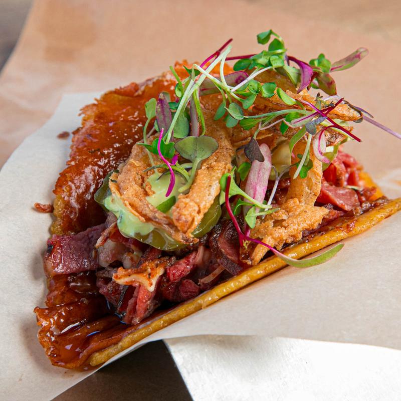 Pastrami, onions, cilantro, pickles, and mustard crema.