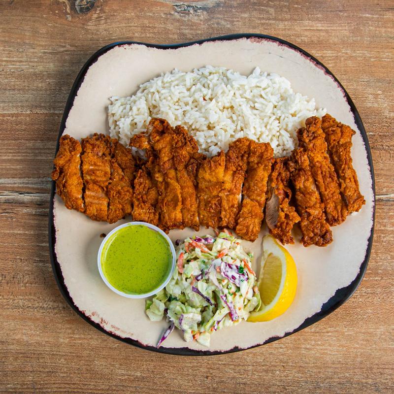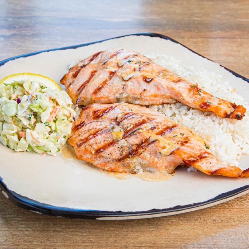 Served with Rice or French Fries and Cilantro Slaw • Add Grilled Zucchini +$1.75 | Add Skewered Shrimp +$3.49 | Add Side Salad +$3.49