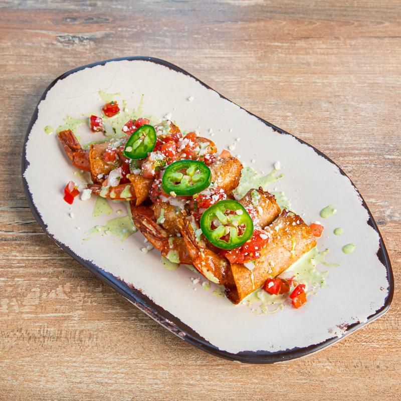 Three taquitos, shredded lettuce, pico, cotija, Mexican crema, avocado crema, and taquito red sauce.